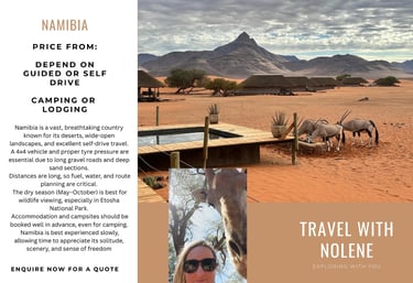 Namibia is a vast, breathtaking country known for its deserts, wide-open landscapes, and excellent self-drive travel.